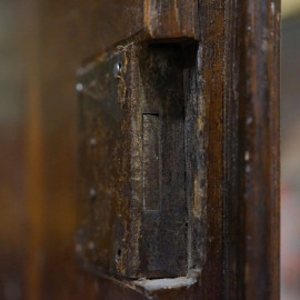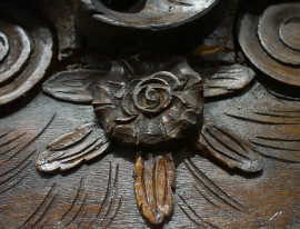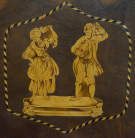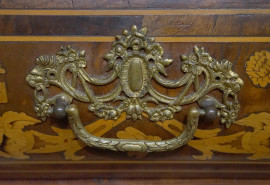 Cornice di linea spezzata centrata da cimasa scolpita con fiore e volute, fronte a due ante pannellate di linea sagomata con riserve raffiguranti vasi con fiori all'esterno e scene galanti all'interno, parte inferiore bombata a quattro cassetti, poggiante su due grandi zampe leonine.