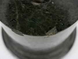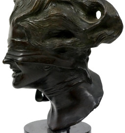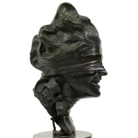 La dea bendata, scultura in bronzo brunito, cm h 27,5, base a mezza colonna in marmo verde, cm h 15, XX secolo, (difetti sulla base).
