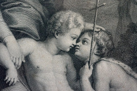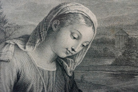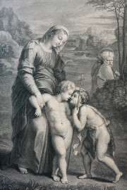 La Sainte Vierge - d'après un tableau original de Raphael qui est dans le Cabinet de Mon.le Duc d'Orléans, cm 45x29, incisore Nicolas de Larmessin (Parigi, 1684-1755), XVIII secolo, entro cornice.