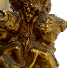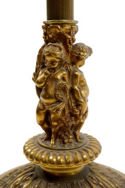 Lampada da terra in bronzo dorato, fusto a colonna scanalata, base con puttini e decori a foglie lanceolate, poggiante su pianetto in marmo verde, cm h 170, XX secolo, (difetti).