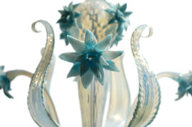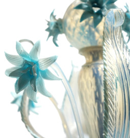 Lampadario in vetro di Murano azzurro a sei bracci con applicazioni floreali, cm 64x56, (mancante il finale)