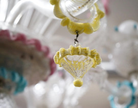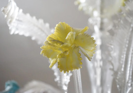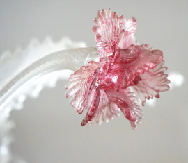 Lampadario in vetro di Murano trasparente e policromo, XIX secolo, struttura centrale da cui si dipartono cinque bracci sinuosi con pendenti e particolari floreali, cm 100x75, (piccolo difetto nella montatura di un elemento)