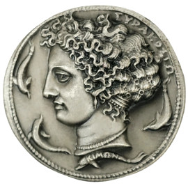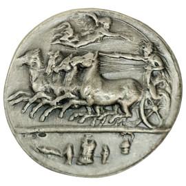 - Moneta "Aretusa "in argento, riproduzione del Decadramma di Siracusa, Banco di Sicilia, diam. cm 3.9, gr. 26 circa