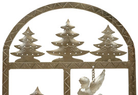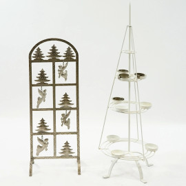 Lotto composto da una decorazione natalizia ed un candeliere a forma di albero di Natale in metallo argentato e laccato bianco, alt. max cm 83