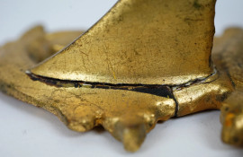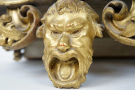 Lotto di due mensole in legno scolpito, dorato e laccato, XX secolo, decori di mascherone e volute, misure max cm 14x42x23, (difetti)