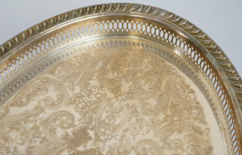 Lotto di due vassoi ovali in metallo agentato, decori incisi e profili a traforo, misure max cm 50x34,5, XX secolo, (segni del tempo).