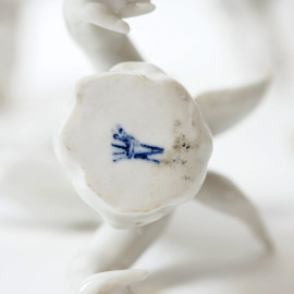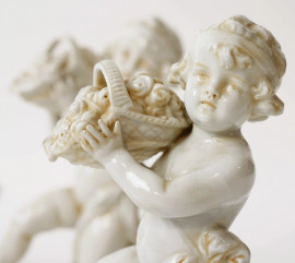 Lotto di undici piccole sculture in porcellana bianca, composto da due saliere, putti giocosi e fanciulli con cestini, alt. max cm 15,5, marcati N coronata sotto la base, (difetti e restauri).