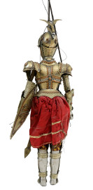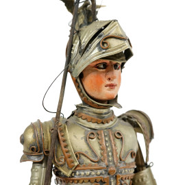 Manifattura siciliana di fine XIX-inizi XX secolo, Pupo in legno dipinto, armatura in lamina di rame e metallo dorato, alt. cm 46, lunghezza totale con manico cm 78, (difetti).