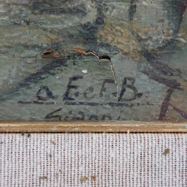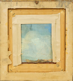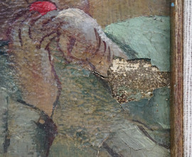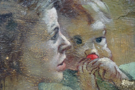 Maternità, olio su tavoletta, cm 20,5x17,5, firmato, in cornice, (difetti)