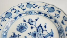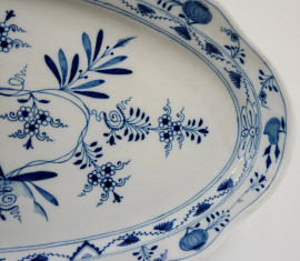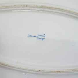 Meissen, due vassoi da portata di linea sagomata , quattro piatti fondi e sei piatti piani in porcellana bianco e blu con decori floreali e vegetali, XIX-XX secolo, misure max cm 61x29, (difetti)