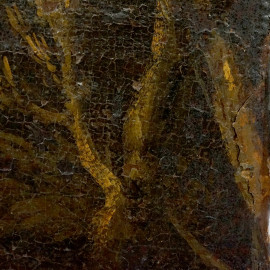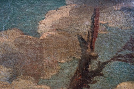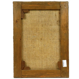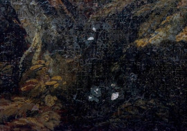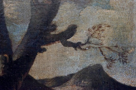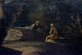 Paesaggio roccioso con tronco d'albero ed eremiti, olio su tela, cm 61x46