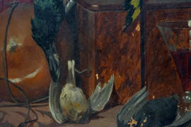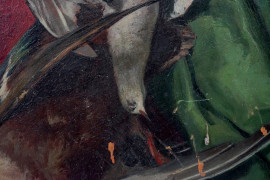 Natura morta - Cacciagione, olio su 31,5x20, firmato e datato in alto a destra F.Santoro 1873, entro cornice, (difetti).