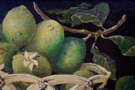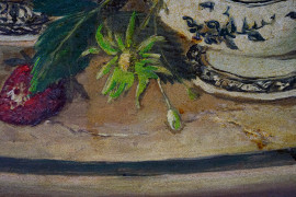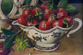 Natura morta - limoni e fragole, olio su cartone, cm 39x40, inizi XX secolo, entro cornice.