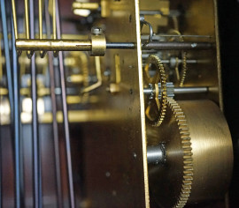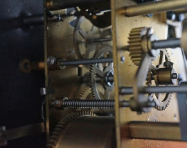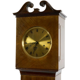 Orologio a torre in noce, XX secolo, cimasa a ricciolo, quadrante a numeri romani, cm h 195x21x32, (meccanismo da revisionare).