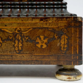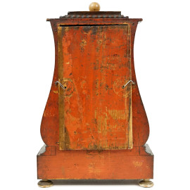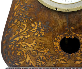 Orologio da tavolo, XIX secolo, cassa con decori floreali intarsiato intorno a quadrante circolare a numeri romani, piedini a trottola, cm h 38,5x24x11,5, (difetti,meccanismo da revisionare)