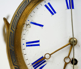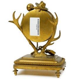 Orologio in bronzo dorato, XX secolo, quadrante circolare a numeri romani sostenuto idealmente da corna d'alce, cm h 24,5x15x11, (meccanismo da revisionare).
