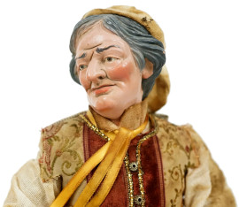 Oste, scultura da presepe in legno scolpito e dipinto, testa modellata in terracotta, occhi in pasta di vetro, cm h 40, Napoli, XX secolo, poggiante su base in legno. Abiti in tessuti diversi, (difetti)