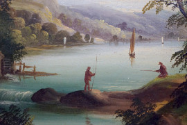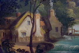 Paesaggio fluviale con figure, olio su tela, cm 26,5x31, prima metà XX secolo, entro cornice, (difetto sulla tela).