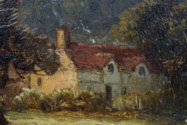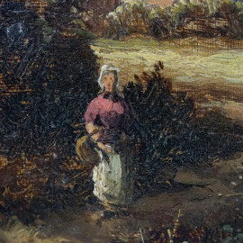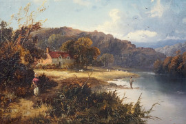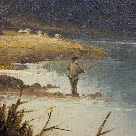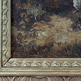 Paesaggio lacustre con figure, olio su tela, cm 26x36, XX secolo, in cornice