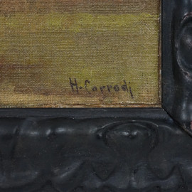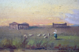 Paestum, olio su tela riportata su tavola, cm 13x27, firmato, entro cornice.