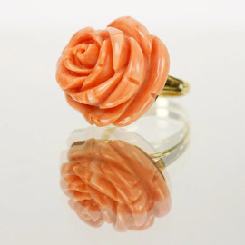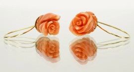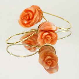 Parure coppia di orecchini e anello in oro giallo 18 kt e corallo intagliato a forma di rosa, misure orecchini cm 3.5 circa