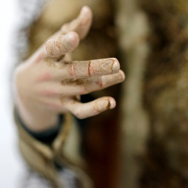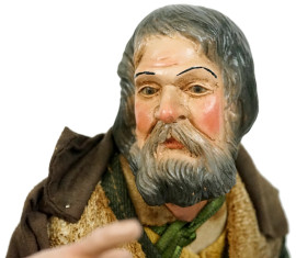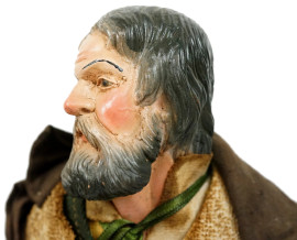 Pastore, scultura da presepe in legno scolpito e dipinto, testa modellata in terracotta, occhi in pasta di vetro, cm h 41,5, Napoli, XX secolo, poggiante su base in legno. Abiti in tessuti diversi, (difetti)