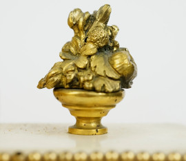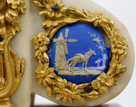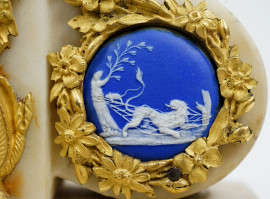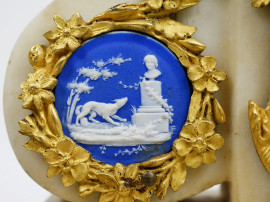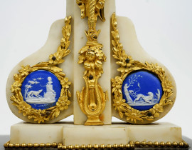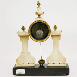 Pendola a portico Luigi XVI in marmo bianco, bronzo dorato e cammei in biscuit, ingombro cm 48,5x36x9,5, (difetti, mancante un piedino e meccanismo da revisionare)
