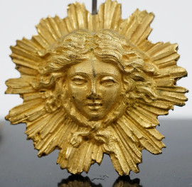 Quadrante centrale circolare a numeri arabi, placchette in biscuit con figure ed animali mitologici, base rettangolare in marmo nero, piedini a trottola.