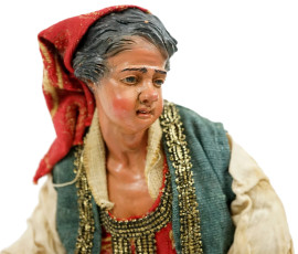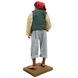 Pescatore, scultura da presepe in legno scolpito e dipinto, testa modellata in terracotta, occhi in pasta di vetro, cm h 38, Napoli, XX secolo, poggiante su base in legno. Abiti in tessuti diversi, (difetti)