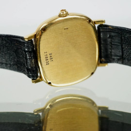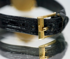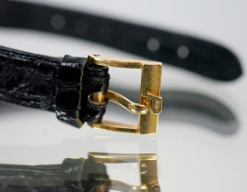 Piaget, Orologio da polso da donna, in oro 18 kt, cinturino in pelle nera, lunghezza cm 20.5, (segni di utilizzo, meccanismo da revisionare).