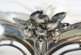 Piccolo centrotavola con vaschetta in vetro e base e metallo argentato, cm 12x22x10, XX secolo, (una presa laterale rotta e mancante).