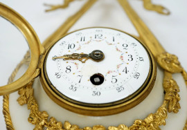 Piccolo orologio da parete in bronzo dorato e marmo bianco, Francia, fine XIX-inizi XX secolo, quadrante circolare porcellanato a doppia numerazione con decoro policromo a festoni, tenuto idealmente da un nastro annodato, cm h 22, (difetti al quadrante, meccanismo da revisionare)