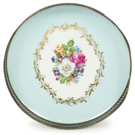Piccolo vassoio tondo in porcellana Limoges, Francia, XX secolo, decoro a bouquet di fiori, ringhierina traforata, diam. cm 19,5, (difetti)