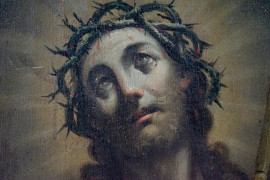 Pittore del XVIII secolo, Ecce Homo, olio su tela ad assetto ovale, cm 84,5x60, entro cornice, (difetti).