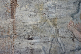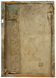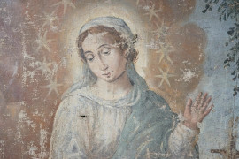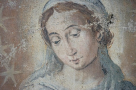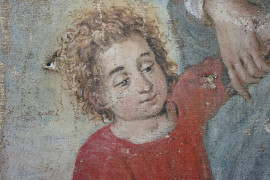 Pittore del XVIII secolo, Madonna con Bambino. Da un legno uscì la morte, uscì la vita […], olio su tela, cm 131,5x90,5, datato, (difetti e cadute di colore).