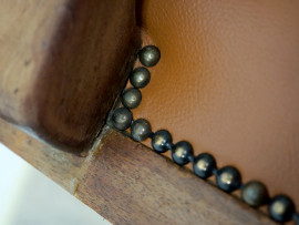 Poltrona anni '70 stile nordico, con schienale e seduta imbottiti e rivestiti in pelle color cammello, braccioli e struttura in legno, cm h 89,5x57,5x68.