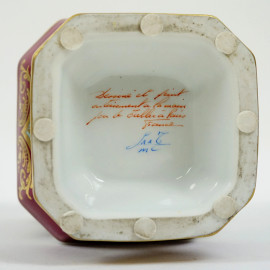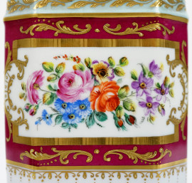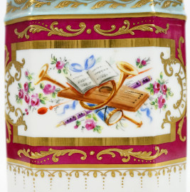 Potiche in porcellana variopinta con riserve rettangolari raffiguranti bouquet di fiori e strumenti musicali, finiture e particolari dorati, Le Tallec, Francia, XX secolo, cm h 30.