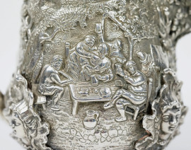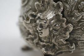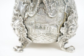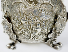 Corpo lavorato con complessa decorazione alternata raffigurante: conchiglie ed elementi marini, teste grottesche e femminili, due scene ispirate rispettivamente ad un dipinto fiammingo di bevitori in osteria ed una scena mitologica. Beccuccio desinente a protome zoomorfa, poggiante su quattro piedini con mascheroni desinenti a ricciolo.