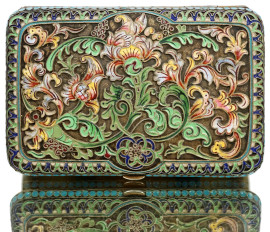 Raffinata tabacchiera in argento con fitta decorazione a volute vegetali, fiori multiformi e motivi circolari a smalti cloisonné policromi, Russia, 1908-1917, cm 10,5x7, peso gr.184