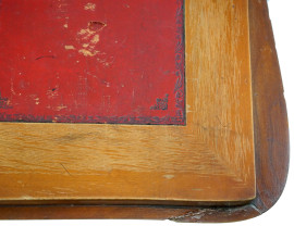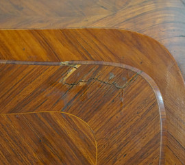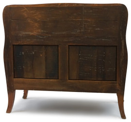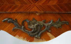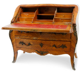 Ribalta in legno impiallacciato, XX secolo, uno sportello a calatoia celante cassettini e vuoti all'interno, fronte a due cassetti, quattro gambe mosse, cm h 95x100x52, (difetti)