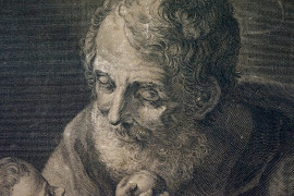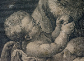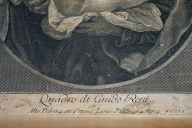 San Giuseppe con Bambinello, incisione, cm 38x28,5, inventore Guido Reni (1575-1642), disegnatore Lorenzo Lorenzi (1724-1787), incisore Antonio Baratti (notizie 1750-1760), entro cornice, (difetti).