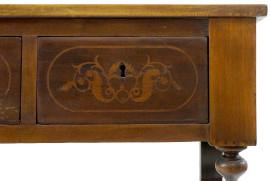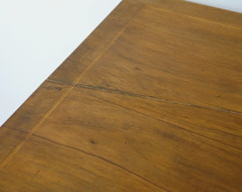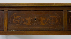 Scrivania Carlo X, XIX secolo, interamente lastronata, fronte a tre cassetti, montanti sagomati, riuniti da traversa, cm 81x118x68,(difetti)