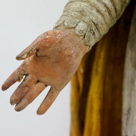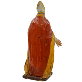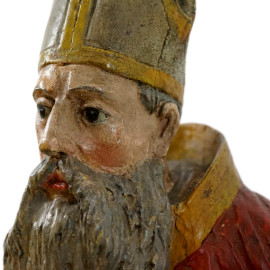 Scultore del XVII-XVIII secolo, San Nicola, scultura in legno intagliato e stoffa, dipinta in policromia e dorata, cm h 90x29x23, (difetti,elementi sostituiti, restauri)