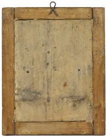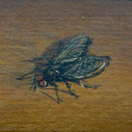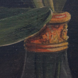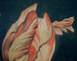 Vanitas con un unico tulipano reciso simbolo della caducità della vita. Le farfalle di colore blu simboleggiano il rinnovamento e la reincarnazione, la mosca grassa e domestica si riferisce alla morte e al decadimento.