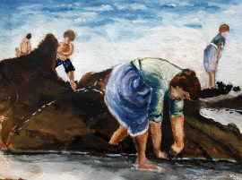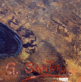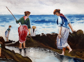 Scuola Napoletana della fine dell’Ottocento, Raccoglitrici di mitili, tempera su carta, cm 22x34, firmato G.Santoro