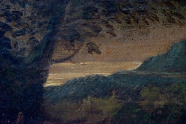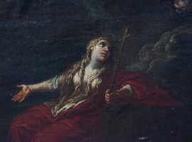 Scuola romana del XVII secolo, Paesaggio con Maddalena, olio su tela, cm 36,5x47.