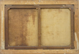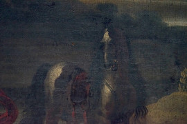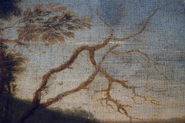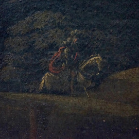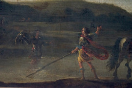 Scuola romana del XVII secolo, Paesaggio fluviale con soldati, olio su tela, cm 86x136, entro cornice di inizi XIX secolo in legno e stucco dorato.