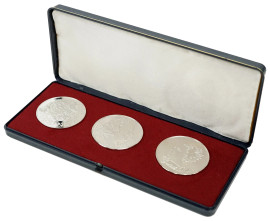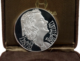 Sei medaglie in argento raffiguranti Brigitte Bardot, Rene Clair, Rita Hayworth, Elisabeth Taylor, Ingrid Bergman, Marlene Dietrich, diam. cm 4.4, peso gr. 147, entro custodie.