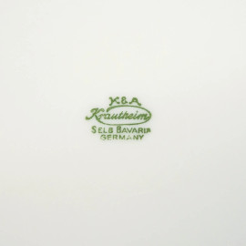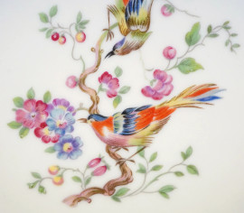Sei piattini da dolce in porcellana Bavaria color crema con cavetti raffiguranti volatili policromi su ramoscelli, diam.cm 20, XX secolo.