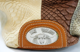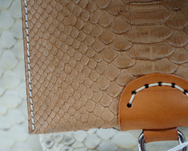Sem Vaccaro, borsa in pitone multicolore bianca, grigia e marrone, manici e finiture in pelle, cm h 40x35x20, utilizzabile anche solo con tracolla, (segni di utilizzo)